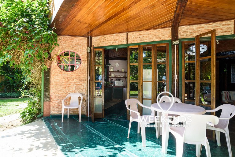 Imagine a charming house where rustic and modern elements blend harmoniously. Located in one of the best areas of Camburi, on the north coast of São Paulo, this house is a peaceful and beautiful retreat, just a 5-minute walk from the beach. With a prime location next to the soccer field on the right side, it’s in one of the quietest and most tranquil areas of Camburi, far from the noise of the main street, ensuring peace and privacy for those looking to disconnect from the fast pace of urban life.